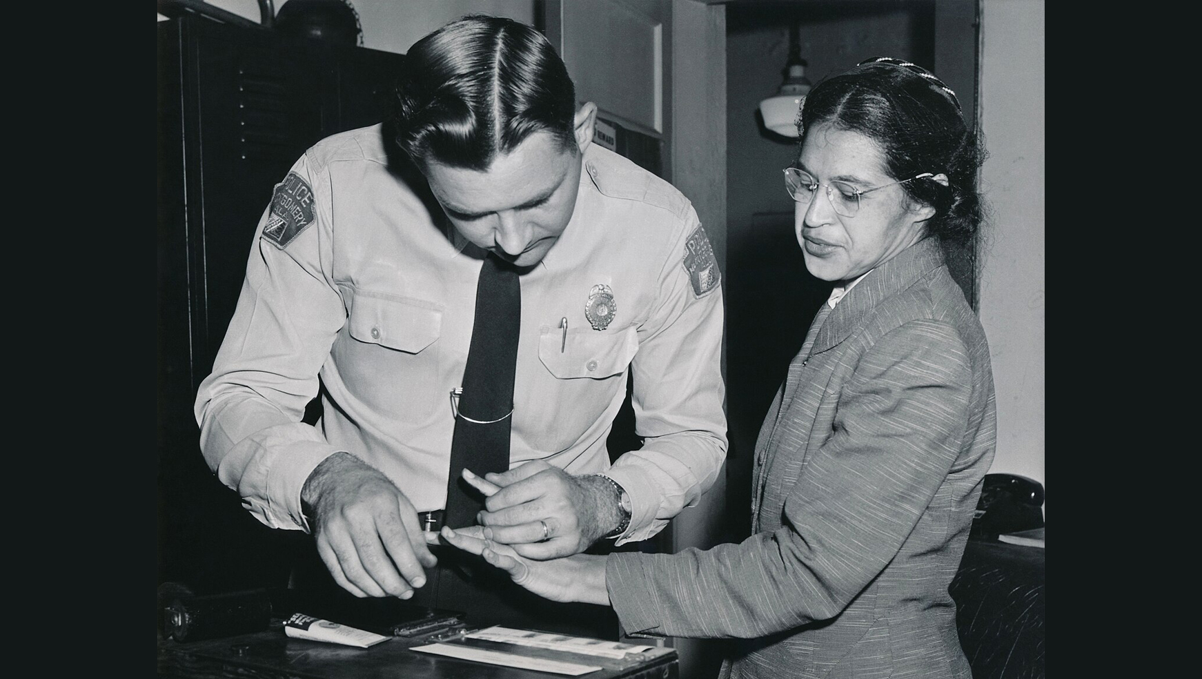 پلیس در حال انگشتنگاری رزا پارکس به اتهام رهبری جنبش تحریم اتوبوسهای مونتگومری، ۲۲ فوریه ۱۹۵۶ (Gene Herrick | Wikimedia)