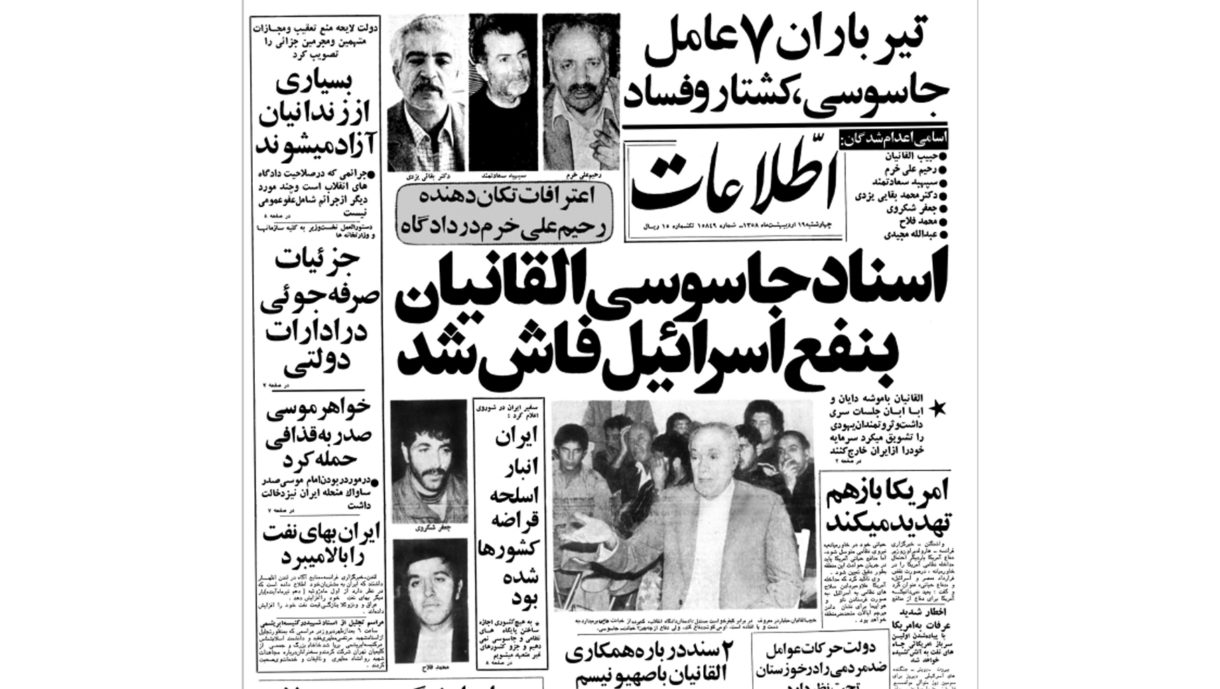 بنا بر گزارش روزنامهی اطلاعات، «حبیب القانیان که معروف بود میتواند ایران را با ثروتش بخرد» در دادگاه متهم شد به «دوستی دشمنان خدا و دشمنی دوستان خدا، جاسوسی بهنفع دولت غاصب صهیونیستی اسرائیل، جمعآوری کمک و اعانه بهنفع اسرائیل و ارتش آن کشور برای بمبارانکردن فلسطین و ملت مسلمان عرب، بهرهگیری از خلق و صرف درآمد در راه ضداسلام و خلق، فساد در زمین، محاربه با خدا و رسول خدا و تمام مردم محروم ما، سد راه خدا و سد راه تکامل ارزشهای انسانی و اسلامی، معاونت در کشتار بیرحمانهی هرروزهی برادران مبارز فلسطینی.»