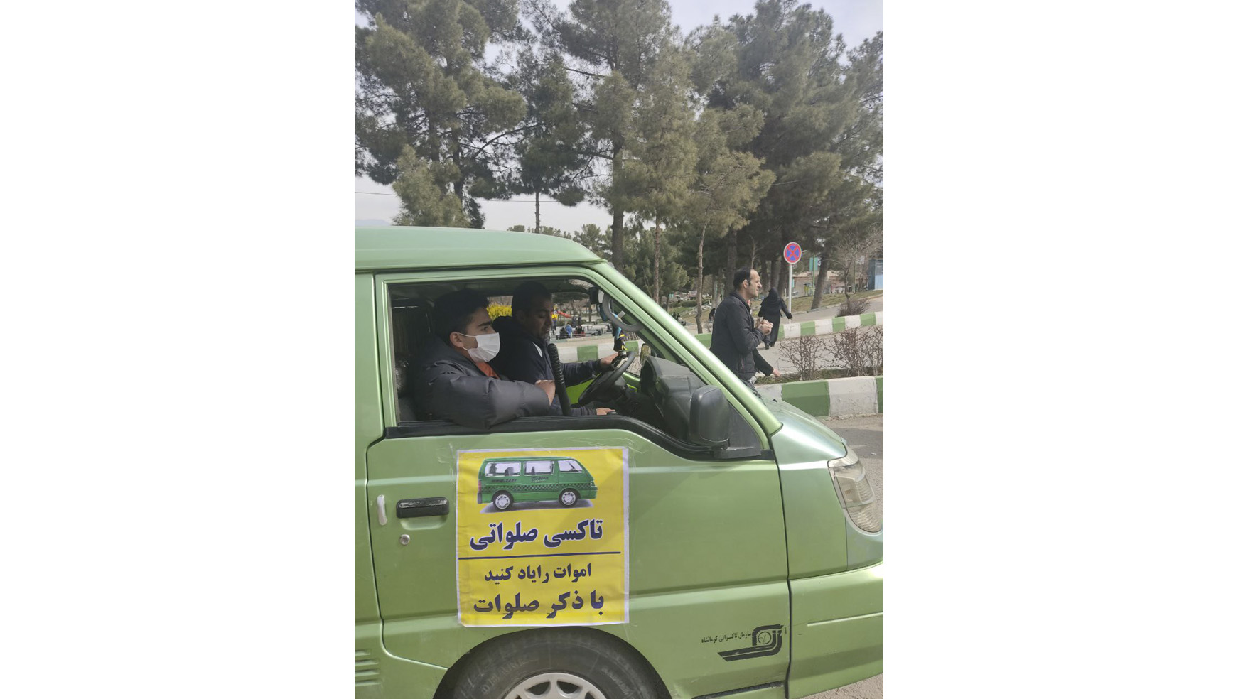 ورود خودرو به محوطه ممنوع بود اما ونهایی بودند که با ظرفیتِ تقریباً هشت نفر و بهصورت رایگان مشغول جابهجایی مراجعین بودند. هرچند تعداد و سرعتشان بهشکلی بود که خیلیها ترجیح میدادند که قدمزنان بهسمت مزارِ مورد نظرشان حرکت کنند. در هر ون صندلیِ کنار راننده مختص یک مأمور نوجوان بسیجی بود که با یک باتونِ سیاه مسافران را در این مسیرِ چنددقیقهای همراهی میکرد. روی درِ هرکدام از ونها هم نوشتهای چسبانده بودند: «تاکسی صلواتی ــ اموات را یاد کنید با ذکر صلوات.»