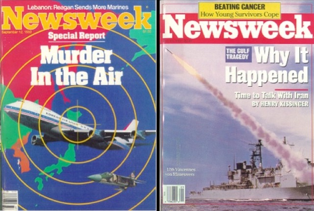 پنج سال بعد از آن، ناو آمریکایی هواپیمای مسافربری ایران را در آبهای خلیج فارس سرنگون کرد و تمام ۲۹۰ سرنشین هواپیما را کشت. این بار البته روایت غالب رسانههای آمریکایی یک چیز بود: «آه، چه اشتباه تأسفبرانگیزی!» در زیر، دو طرح روی جلد هفتهنامهی آمریکایی نیوزویک را، که این دو واقعه را پوشش داده، در کنار هم میبینید.
